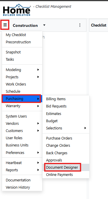 Go to the navigation menu and select Purchasing. Then select Document Designer.